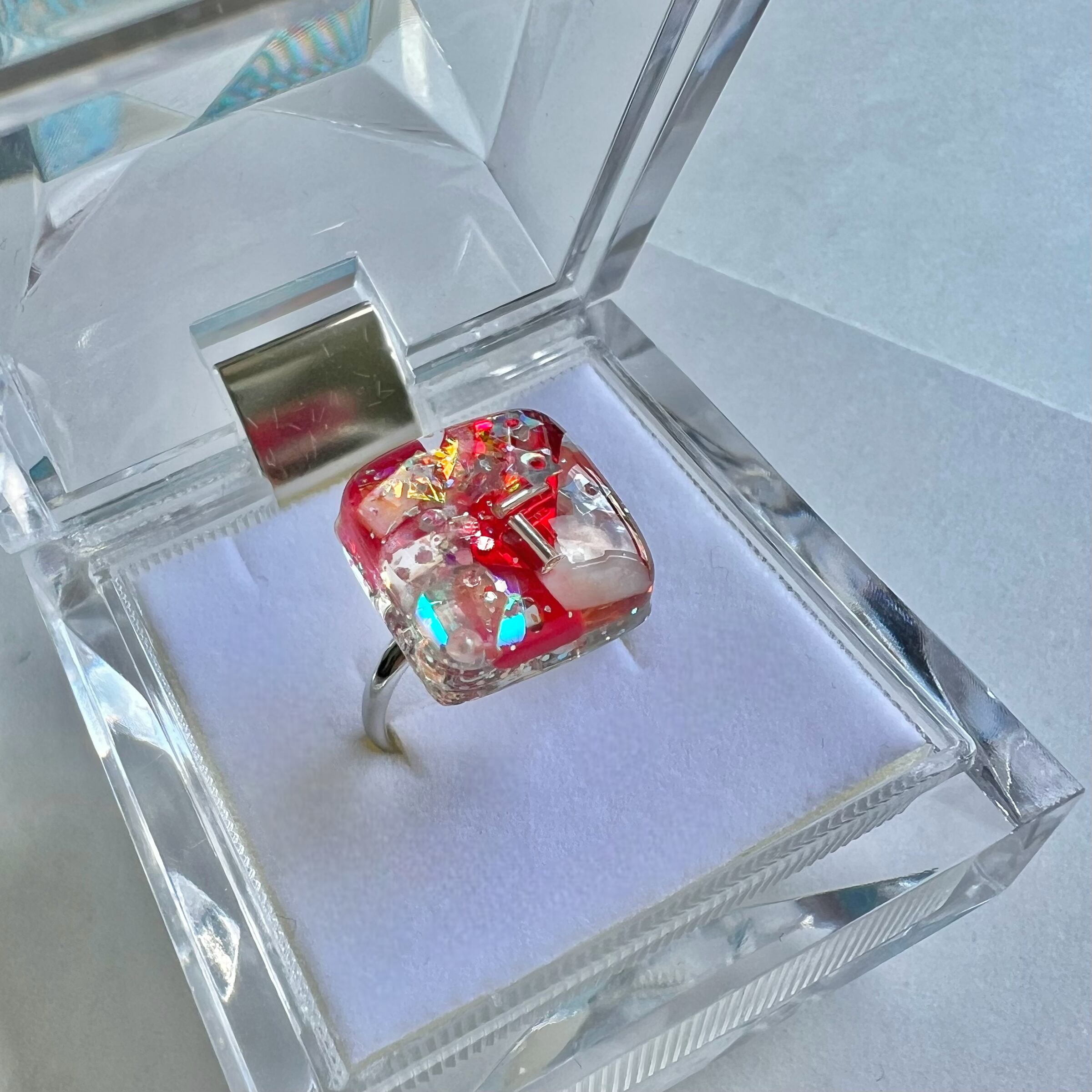 スクエア型の中に、小さなスパンコールやシェルの破片などを封じ込めています。